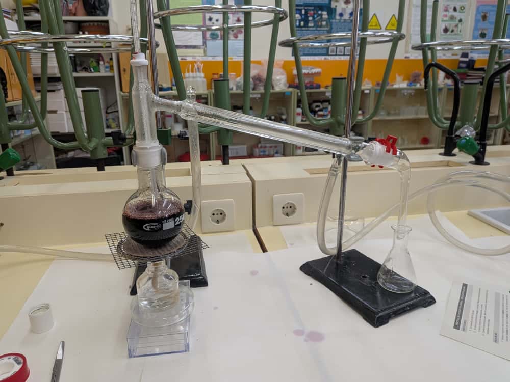 El alumnado de 4.º de ESO ha realizado esta semana una práctica de laboratorio centrada en la destilación, uno de los métodos más clásicos y eficaces para la separación de sustancias. A través de esta experiencia experimental, han podido observar cómo, aprovechando las diferencias en el punto de ebullición, es posible obtener nuevamente un líquido puro a partir de una mezcla inicial.